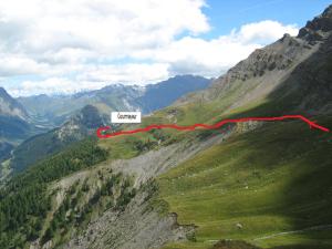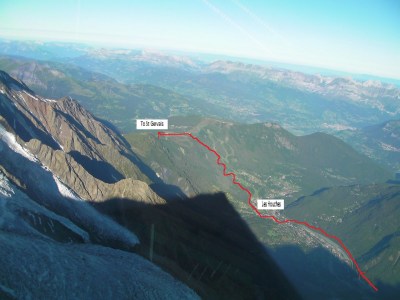| Italy: Looking NE from the Arete du Mont Favre towards Courmayeur. After that the route continues onto the green ridge and off towards the top left hand corner. |