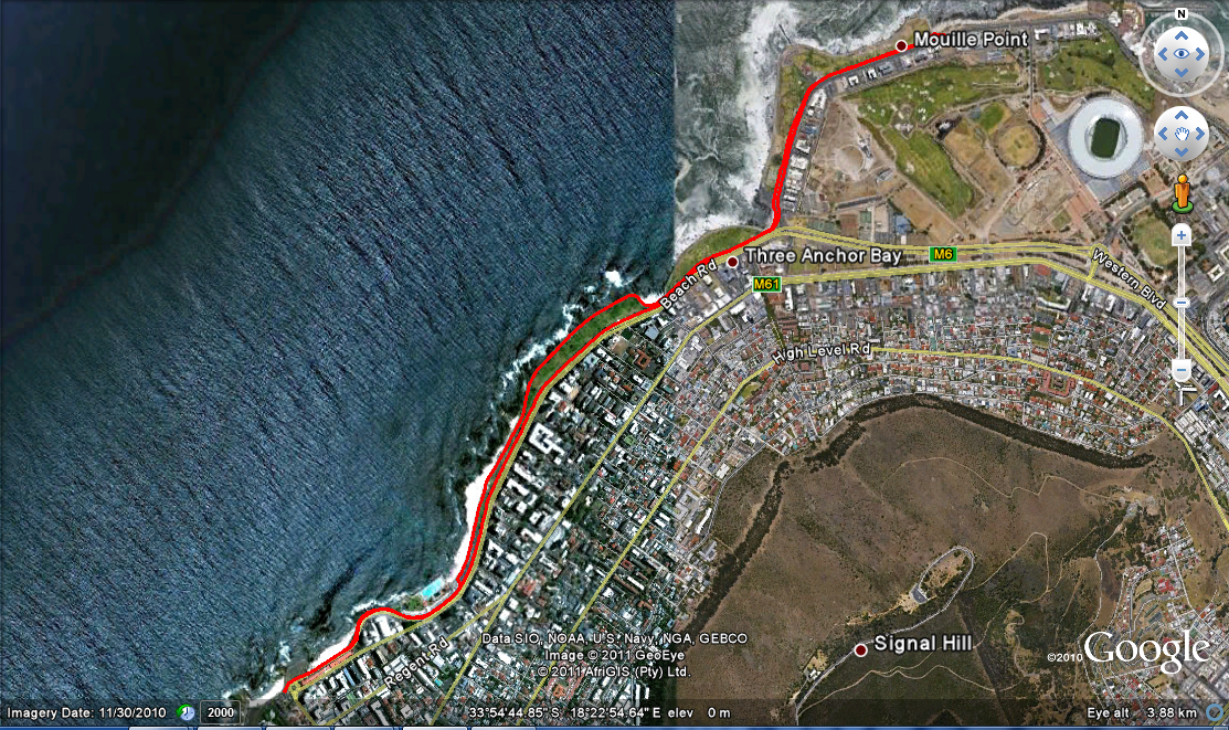 For those who don’t know the promenade. It is a thin strip of pavement/cobbled walk way sandwiched between the Beach (main) Road and upmarket apartments and the wide Atlantic Ocean. It is one of those must run/walk/leisure strole experiences to do at least once in your life. The only other urban running experience which I feel comes even close is running across the Golden Gate Bridge in San Fransisco.