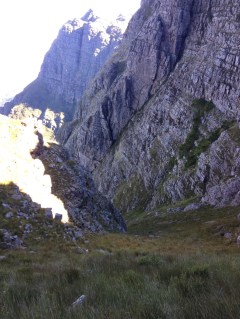 Head onto the Contour Path from the gate side (I climbed up from the White Bridge but this looses too much altitude). You will see the obvious orange overhanging wall to the right of the grassy slabs. head onto the ridge leading up to this. A vague path can be found on the crest. ascend up to the base of the rock. There is a larger tree and bivy spot just above a waterfall which is dry in late summer. traverse left on a grassy ledge onto easy scramble terrain. scramble for about 100m picking the easiest line. You will reach a narrow ridge which looks down into the gully to the left.