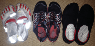 | on my shoe rack (l to r): Vibram Five Fingers Bikila, Merrel Trail Glove, Vivo Barefoot (model unknown) |