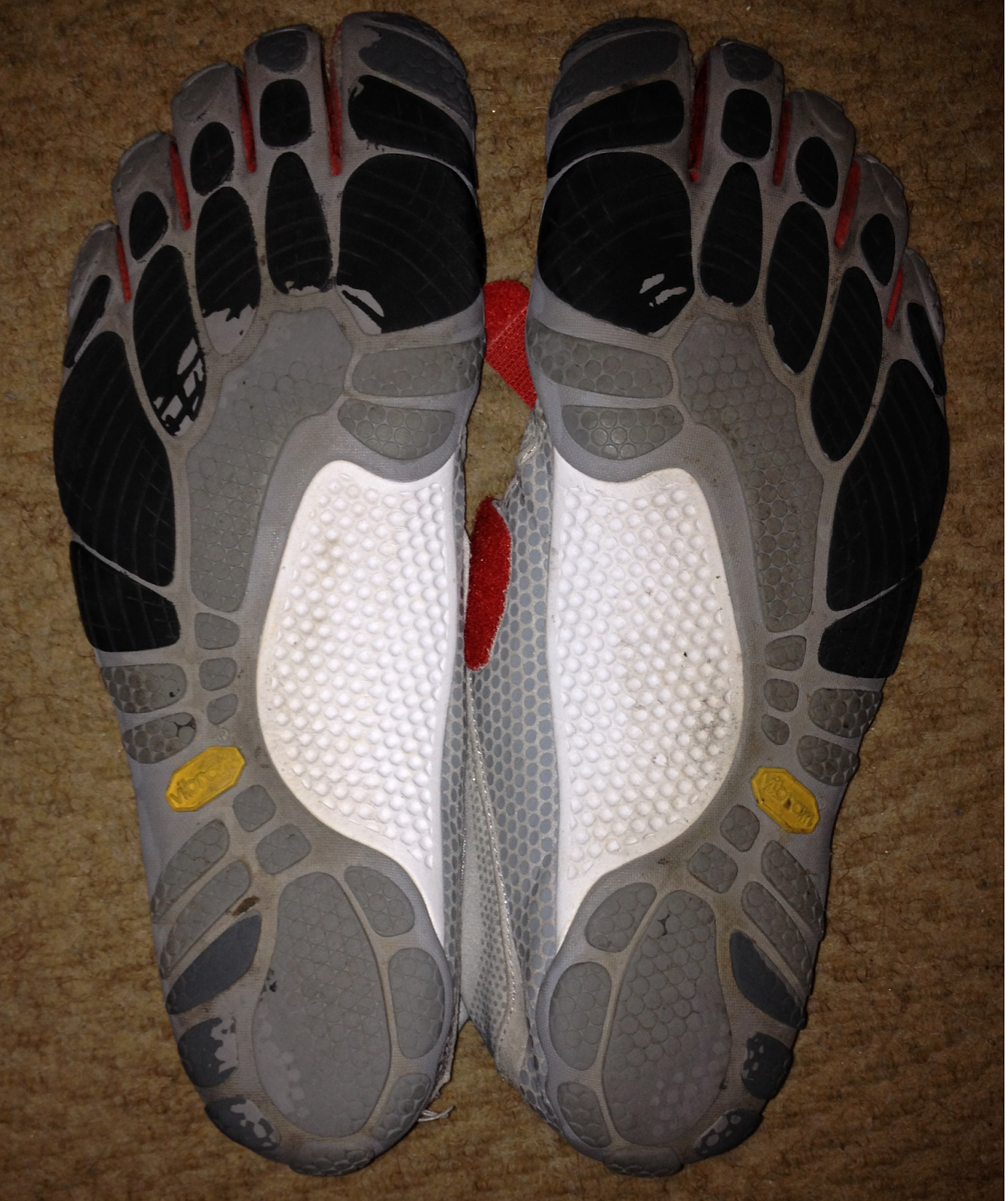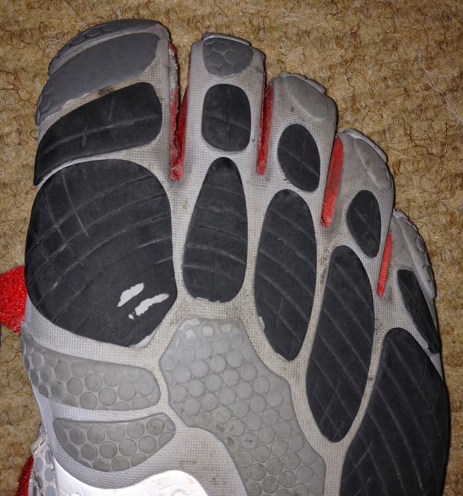 The minimal shoes that I have worn the longest and in some way are my favorites are the Bikila from Vibram Five Finger below. Well I noticed something rather interesting over the months. Let’s look at the bottom of the shoes at the wear. First of all I am amazed how little wear there is after two years of wear most days to work. Have a look at the image on left closely.