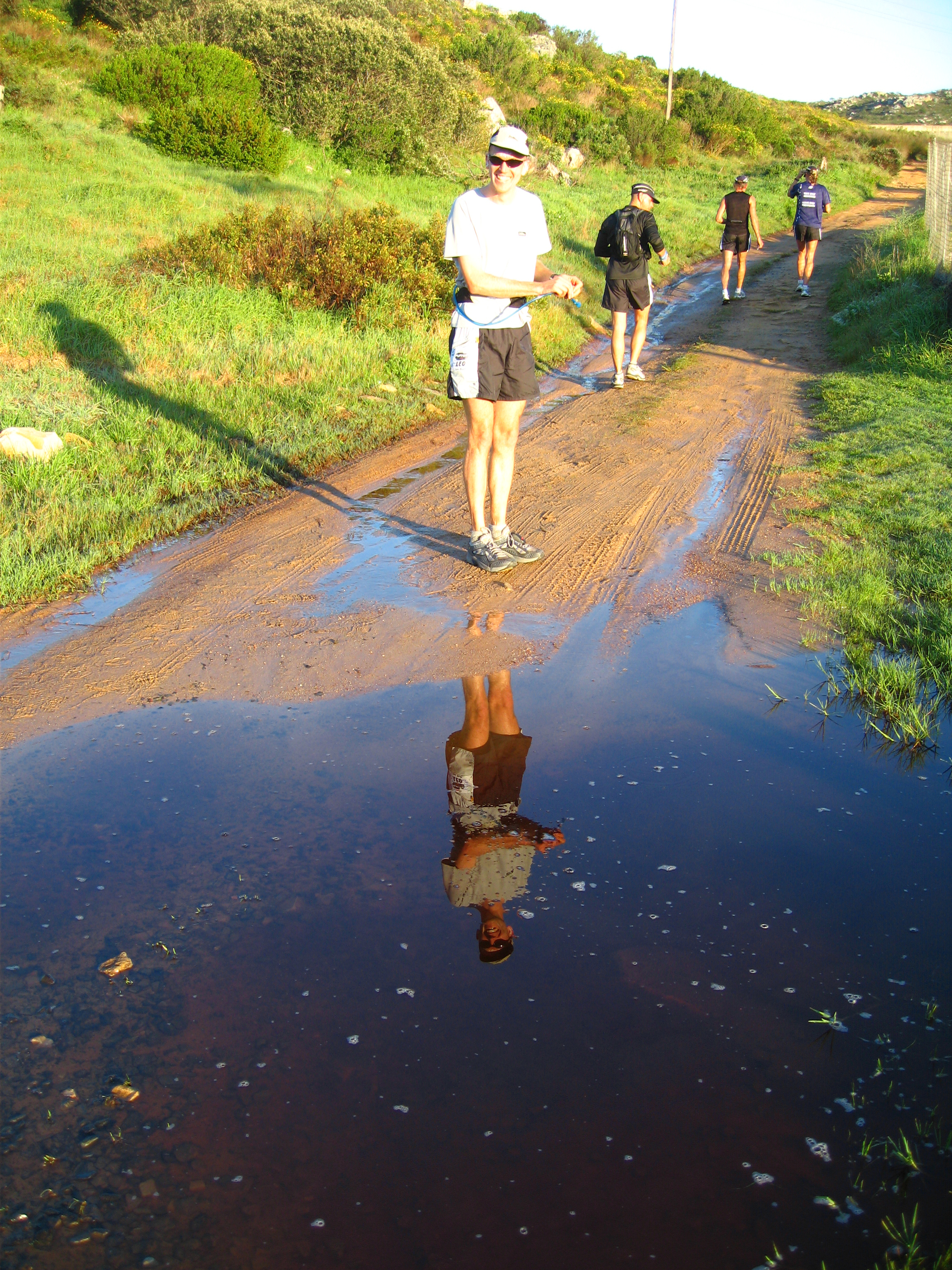 You will know that you will get wet feet past Redhill and just below the Ou Wapad short cut. I would plan to change from road shoes into trail shoes at the start of the Ou Wapad.