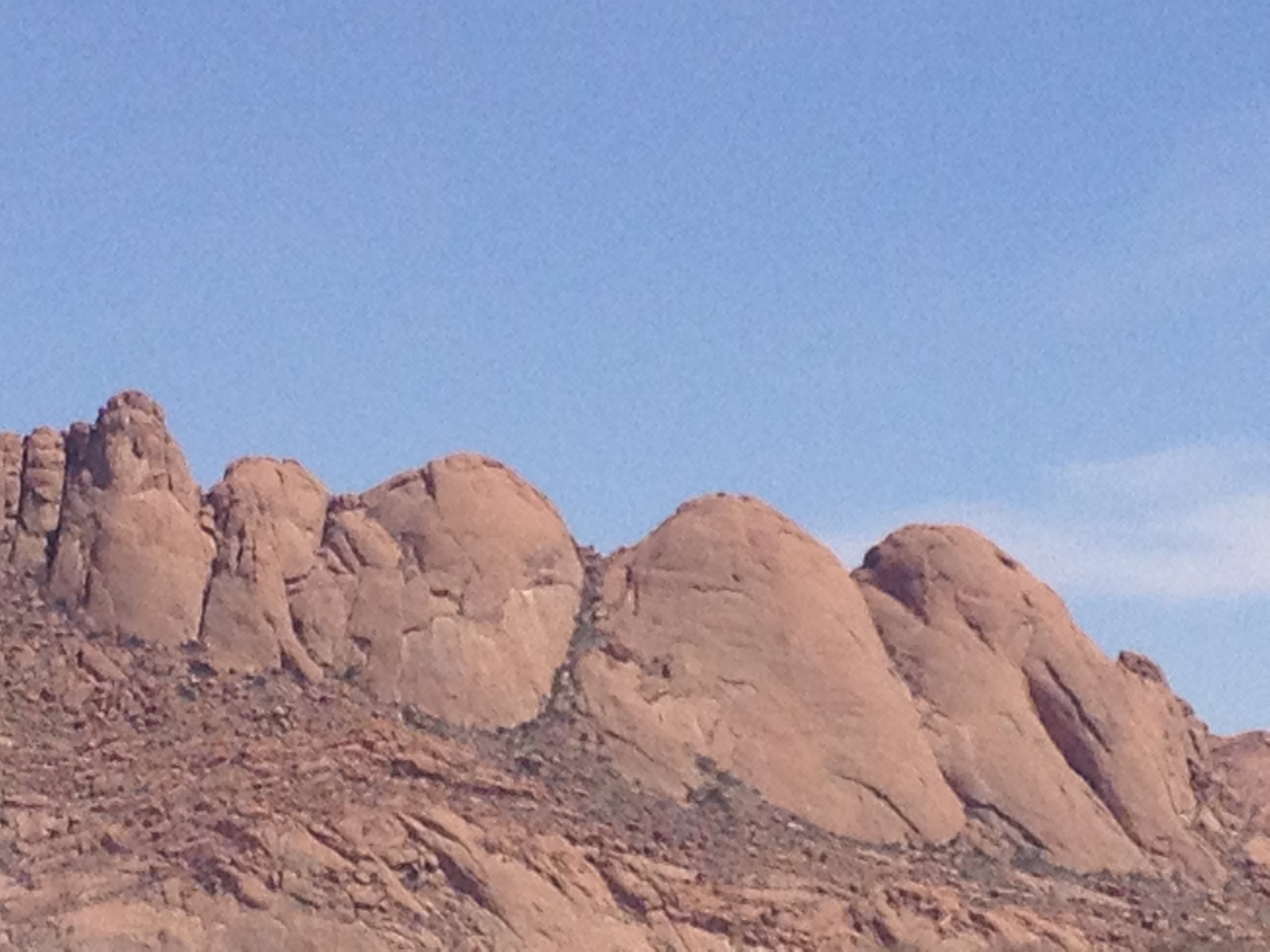 The easiest scramble ascends the dome between campsite 1 and The Bridge (a natural rock arch best viewed at sunset). This is south of the gap between the gap between the Pontoks and Gross Spitzkoppe. Park at Campsite 2 and ascend the gentle ramp to the left. This curves up and after a couple of minutes you will pass rock pools (these will obviously only have water after heavy rains) There is a nice shady spot here. Continue up to the left, curving to the right where it steepens slightly. You will find a rock step here with one tricky move. The rest is an easy slop to the top with great views.