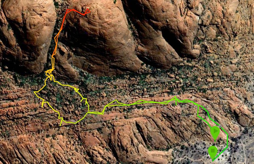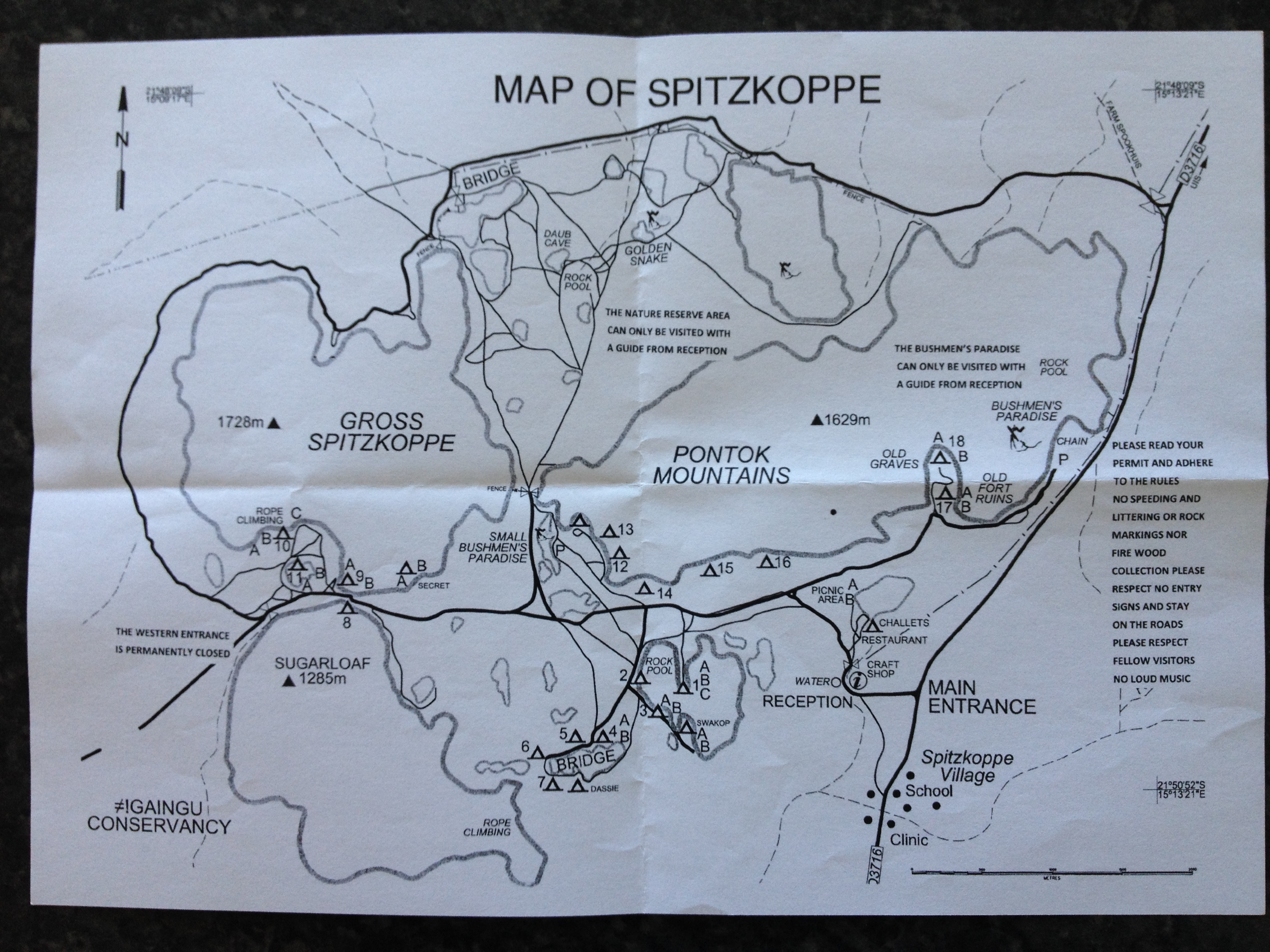 Spitzkoppe Overview showing the Swakop scramble in blue, Pontok 3 in multi colour and the A indicates the gate to the reserve